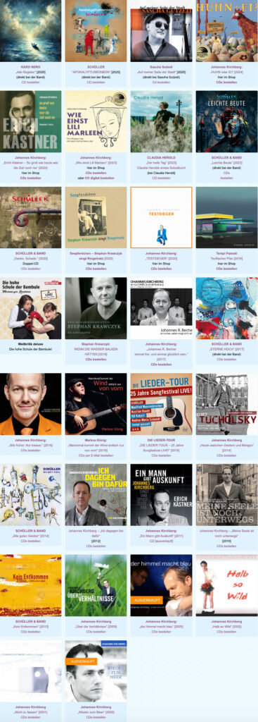Immer wieder brachte Johannes Kirchberg aber auch CD’s bei anderen Labels heraus. So 2009 die CD „Über die Verhältnisse“ bei Acoustic Music und 2004 „Ich dagegen bin dafür“ bei einLächeln. Die Wolfgang Borchert CD „Meine Seele ist noch unterwegs“ erschien bei Buchfunk.